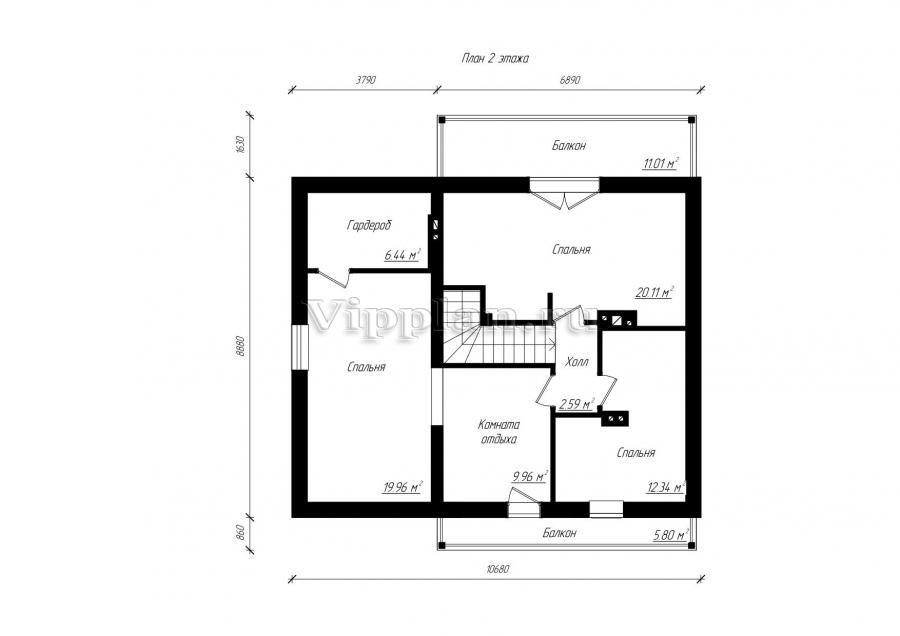 Проект индивидуального двухэтажного одноквартирного жилого дома с размерами 10,68 x 8,88 м.